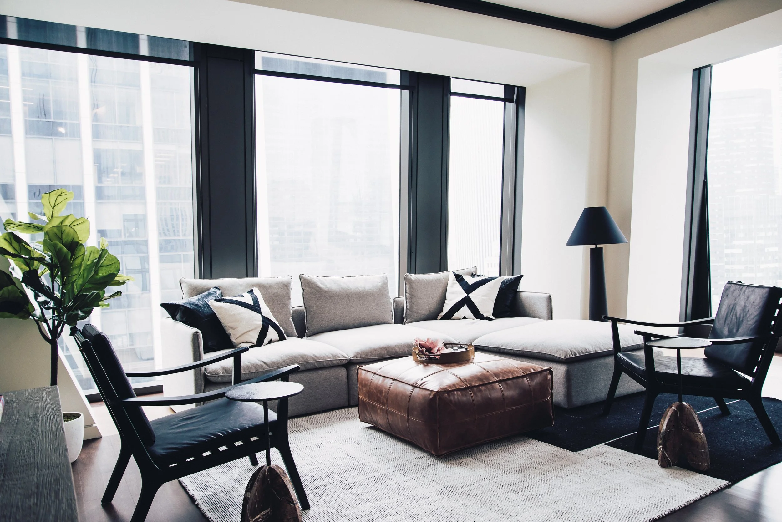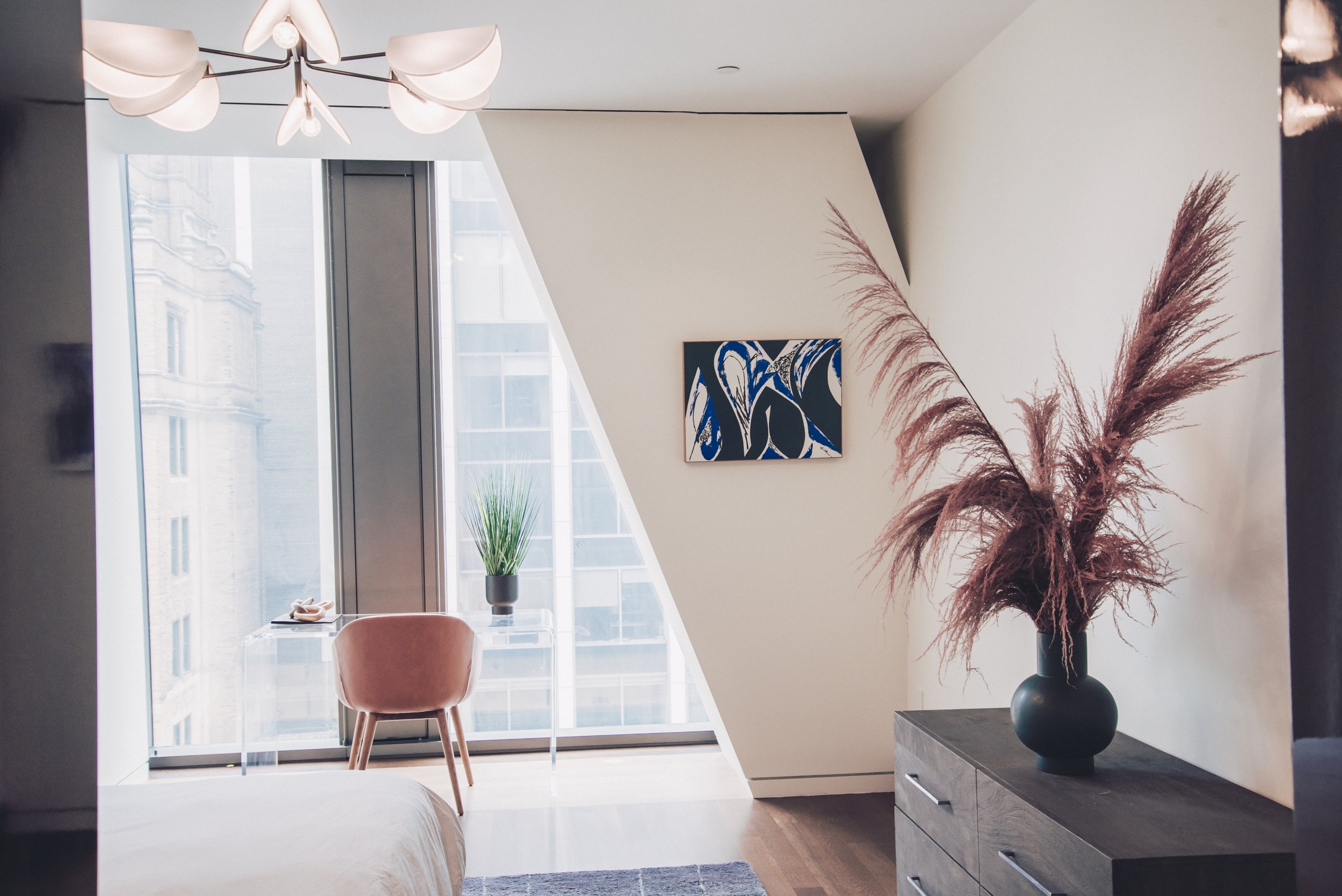 This NYC pied-à-terre apartment was designed to maximize the stunning natural light streaming through its oversized windows, showcasing breathtaking cityscape views at every turn. We curated a warm, modernist interior with layered textures, curated artwork, and carefully selected furnishings to create a stylish, inviting retreat above the city streets.